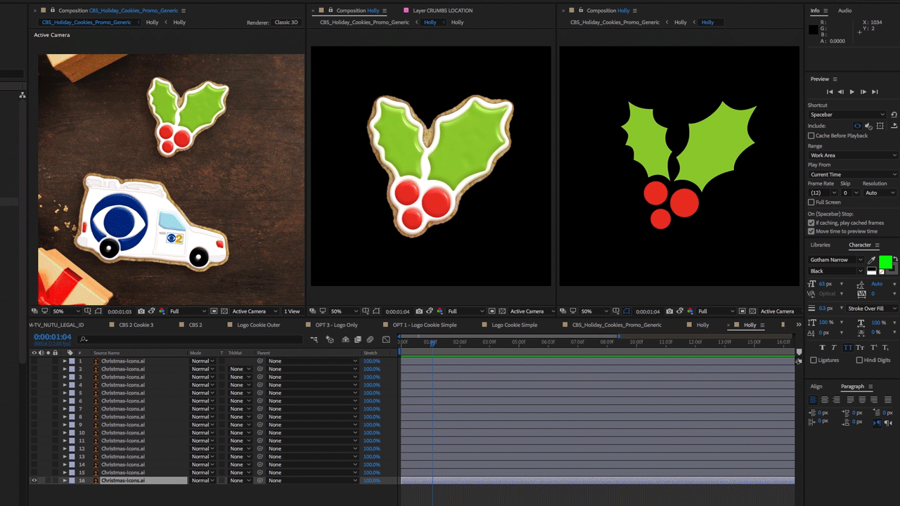 CBS 2 Chicago needed a promo to air throughout the holiday season. Instead of relying on live-action footage and talent, I pitched this animated approach that was flexible and could easily be versioned by other CBS stations. These “procedural” cookies could be swapped out with icons or logos, or custom designed for different cities.