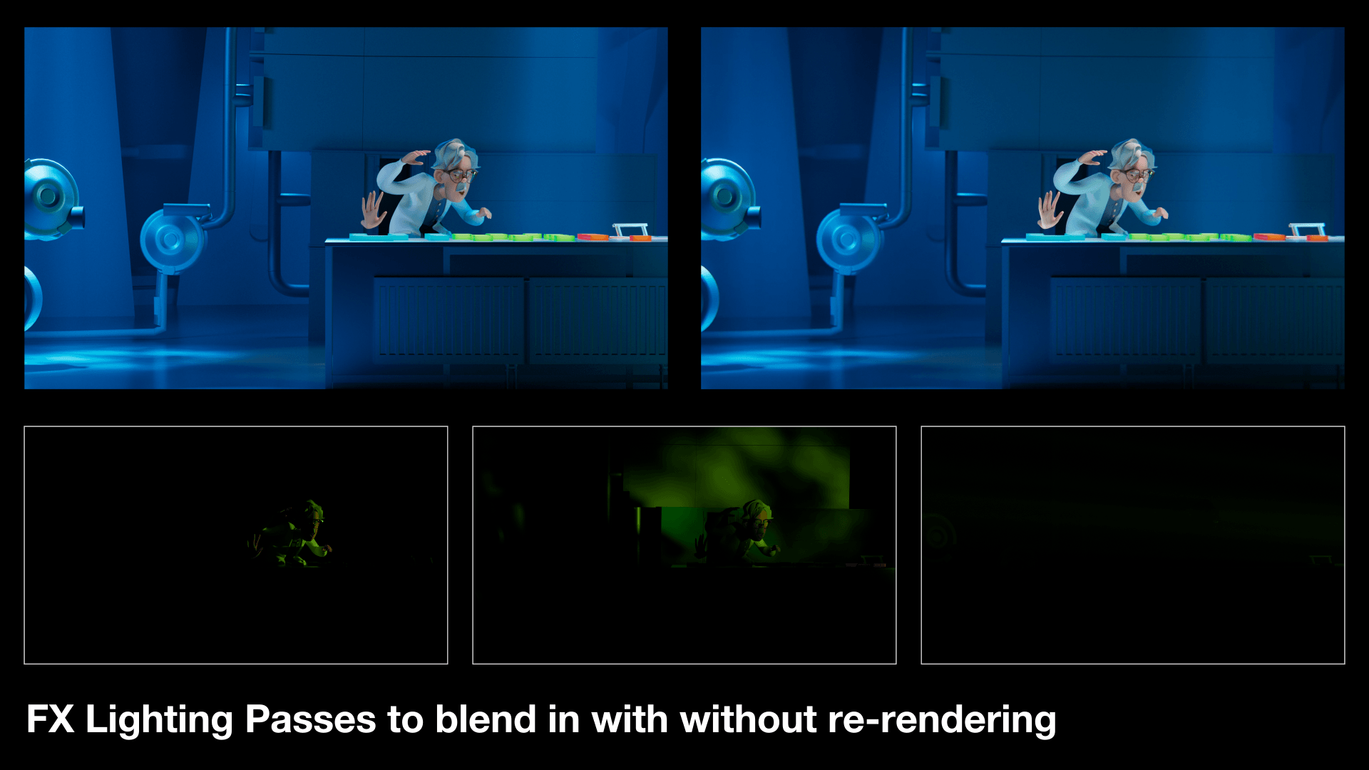 The incredible character animation is by Fabio Pugliese (CG Riff), which served as the blank starting point to light the scene, provided as an alembic file.